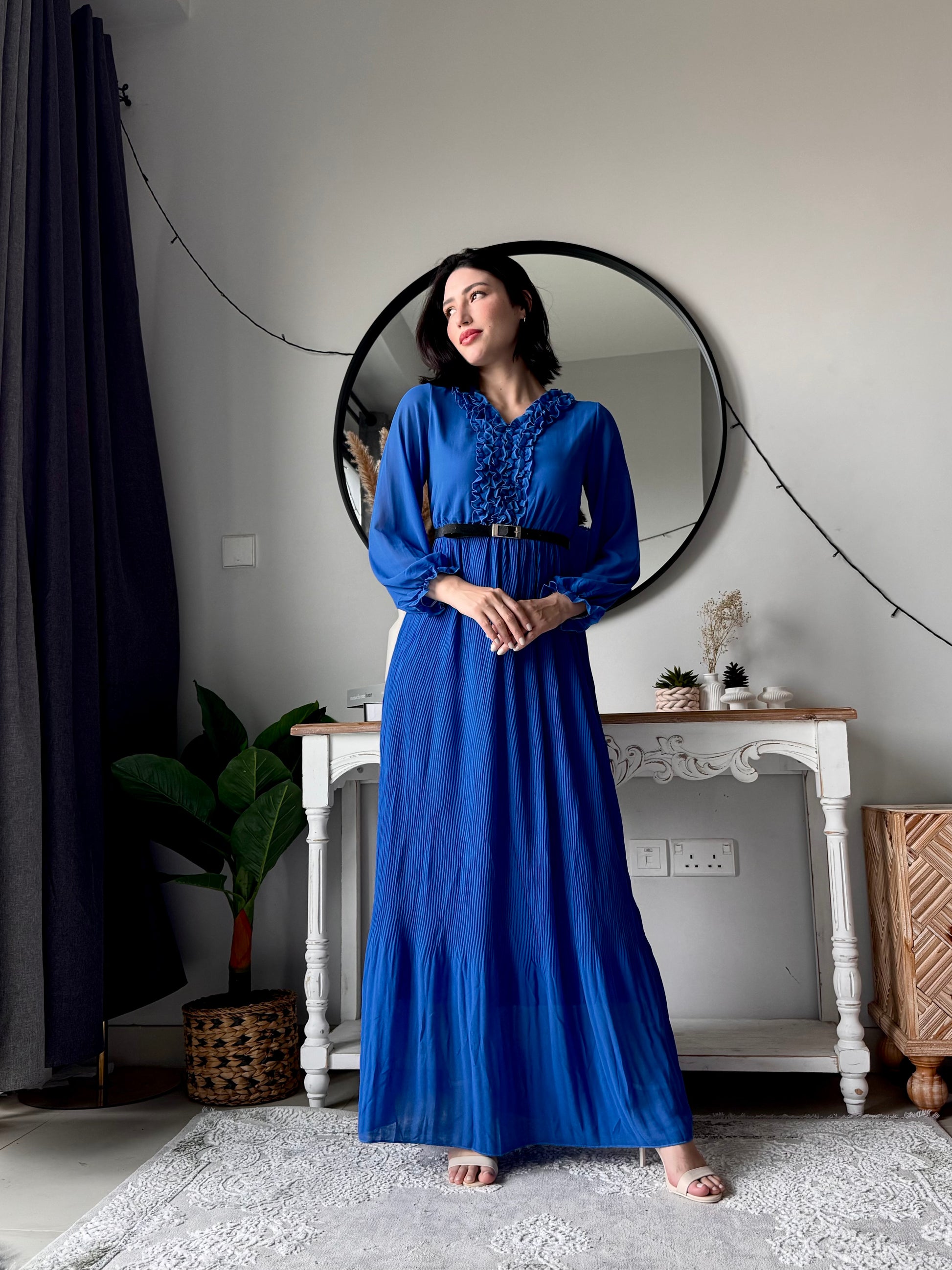 Make a graceful statement with this beautifully pleated chiffon maxi dress, designed to flatter with every movement. Featuring delicate ruffle details on the bodice and a defined waistline accentuated by a sleek belt, it blends modesty with timeless style. The airy chiffon fabric ensures comfort while keeping you effortlessly elegant.
