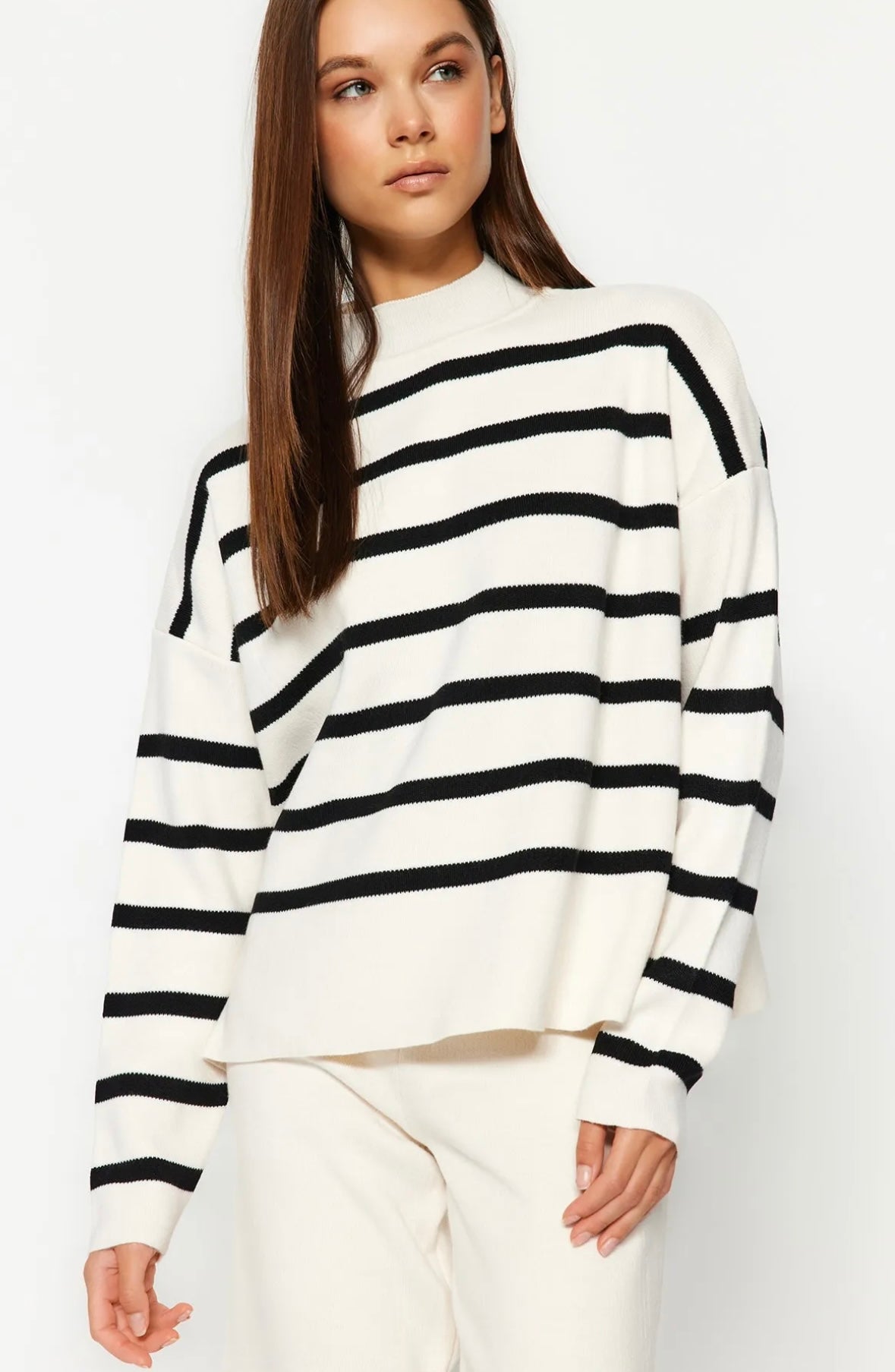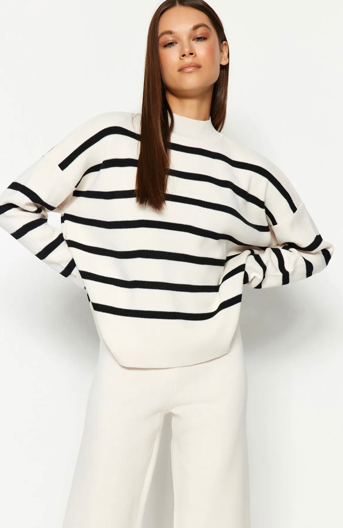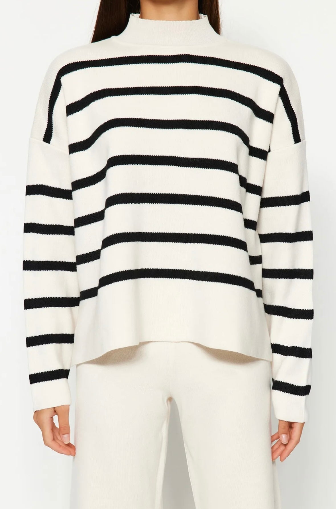 Cozy up in our chic striped knitwear shirt featuring timeless black stripes, perfectly paired with soft, oat-toned trousers. Crafted for warmth and style, this winter ensemble combines a sleek design with ultimate comfort, an effortless choice for chilly days.